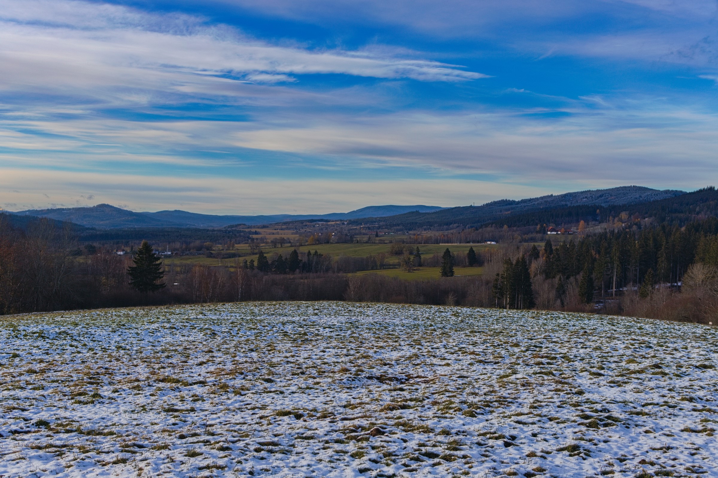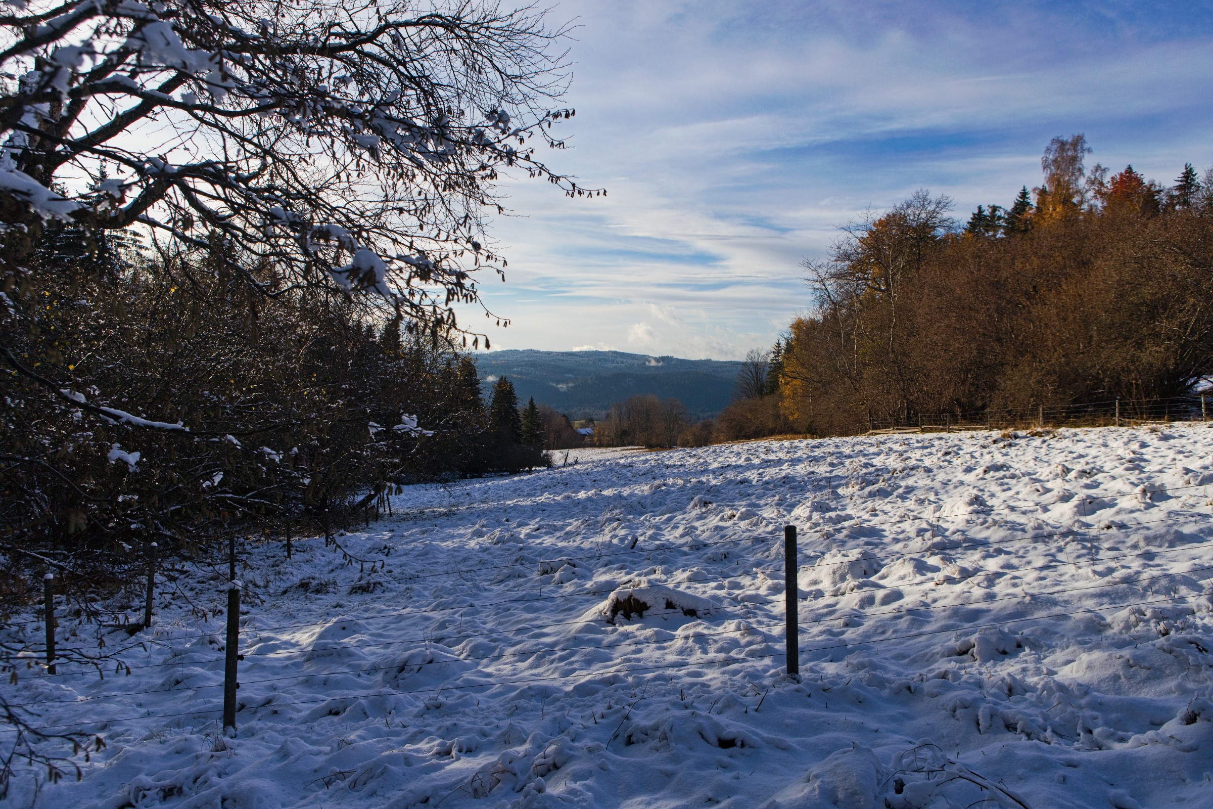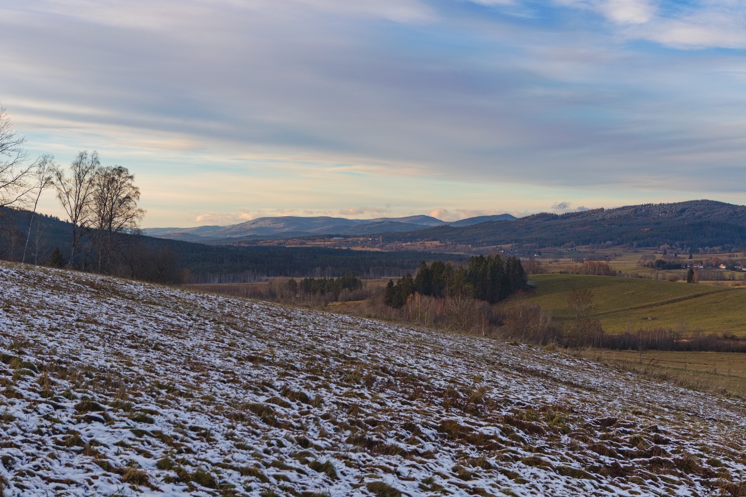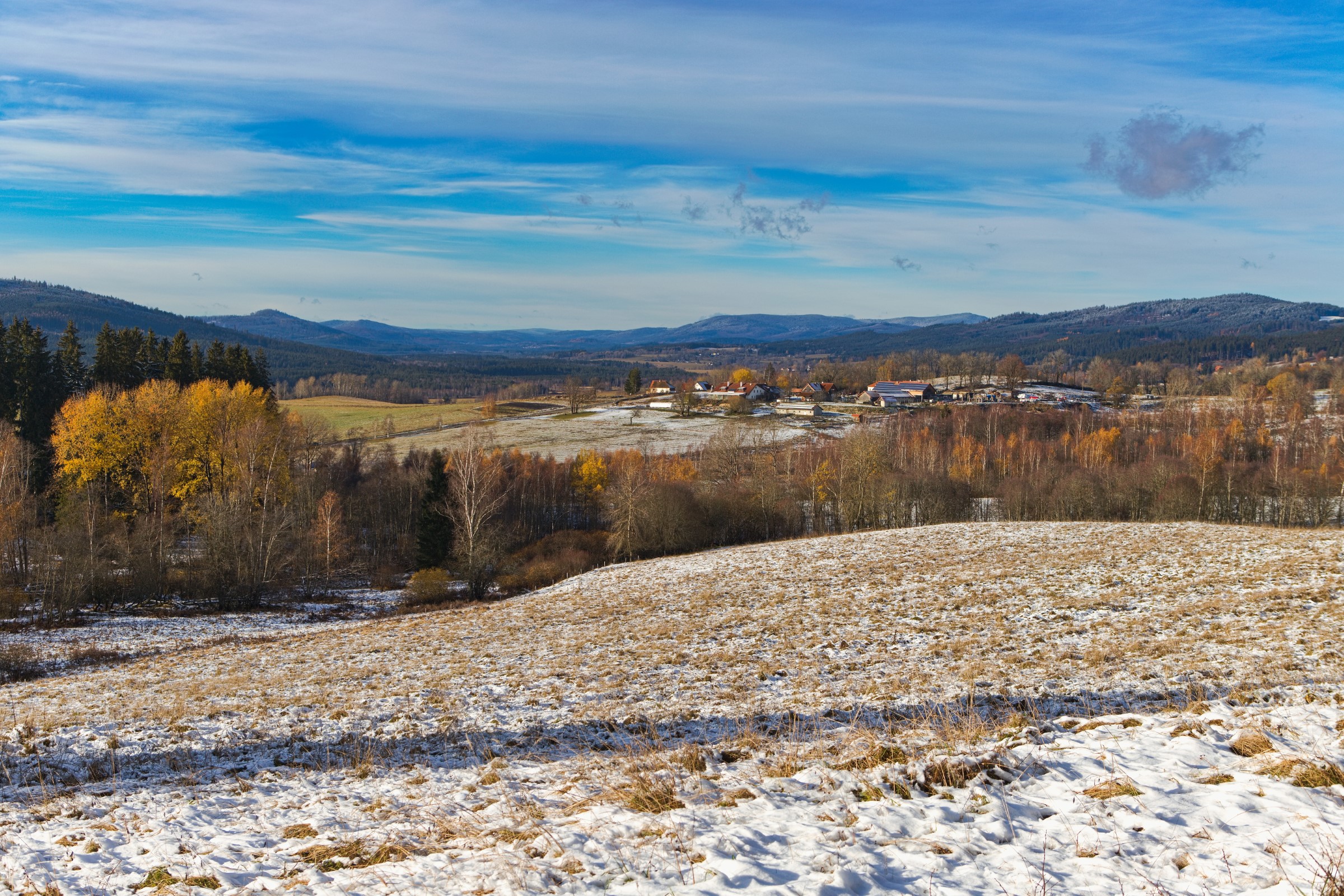 Teploty se i přes ochlazení drží v druhé listopadové dekádě mírně nad průměrem. Většina dosavadních listopadových srážek (podrobněji jsme informovali v aktualitě: Za polovinu listopadu více srážek než v září a říjnu dohromady) spadla v polohách pod 1000 m zatím ve formě deště. Pouze nejvyšší polohy zaznamenaly v listopadu zatím převahu sněhových srážek, ale díky oblevám sníh většinou rychle roztál. 17. listopadu, kdy byly pořízeny naše snímky, byla sněžná čára po ránu kolem 750 m, během dne se posunula nad 800 m. My jsme se s fotoaparátem vypravili právě do těchto poloh a zdokumentovali okolí Želnavy, Slunečné a meandrů Vltavy nad Lipnem. Sněhová pokrývka slabě přibývala s každým výškovým metrem. V místech, kam se nedostaly sluneční paprsky, byl sníh prachový, na jižních svazích mokrý a tající. V lesích sníh ležel jen lokálně podle hustoty porostu. Pod hranicí 800 metrů ležely jen zbytky rozbředlého sněhu. Prostě něco mezi podzimem a zimou.