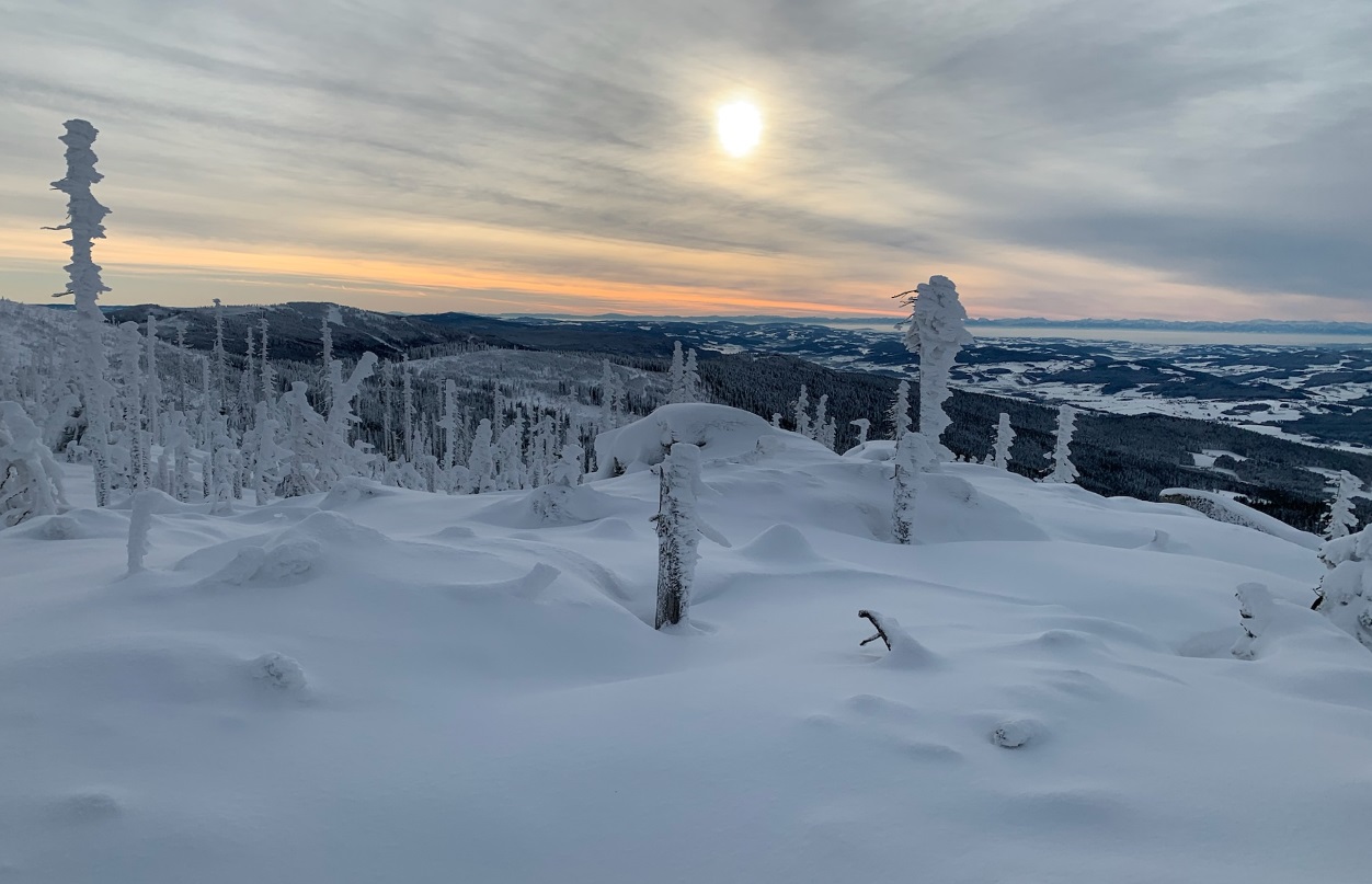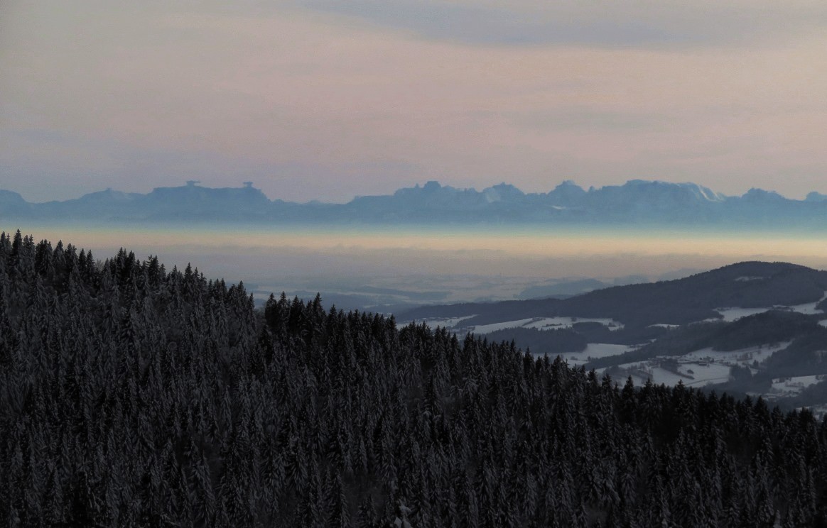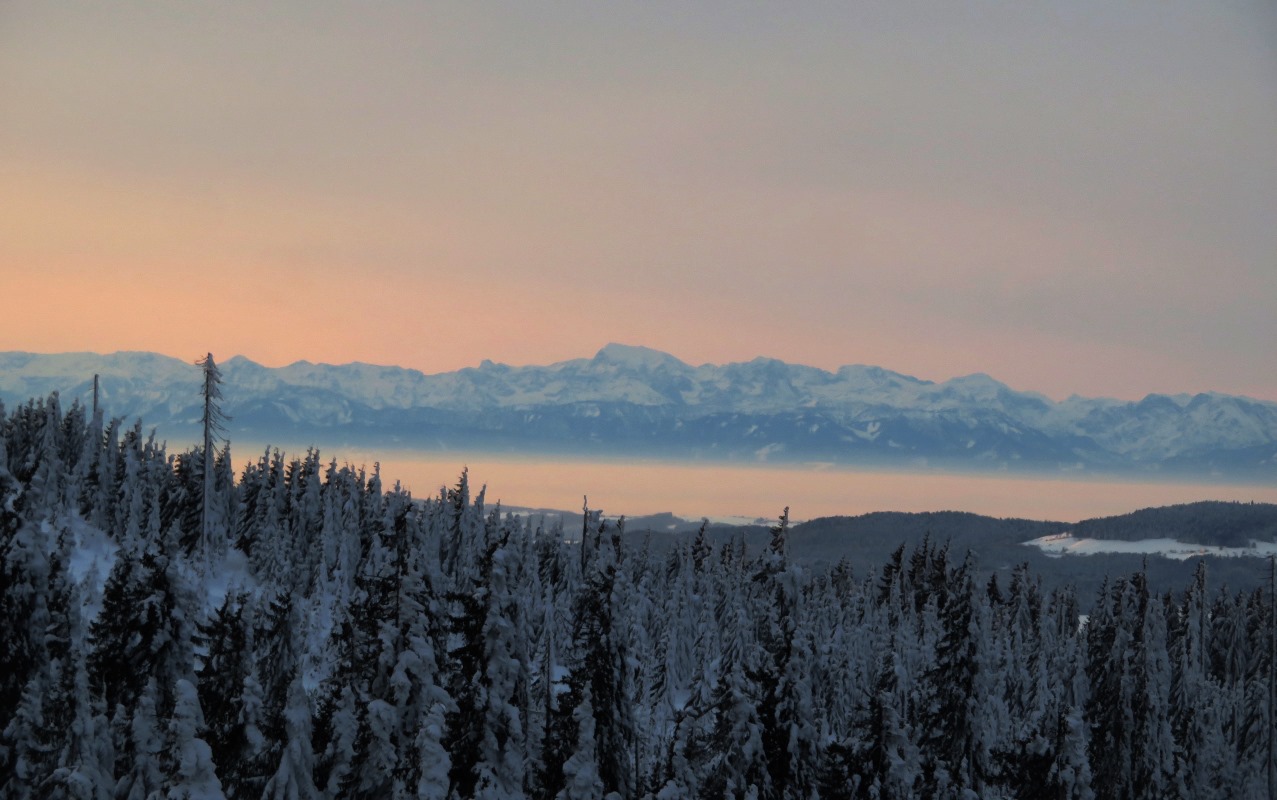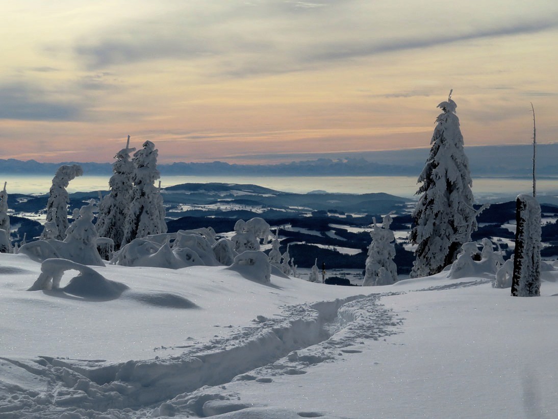 Postupně se nasouvající řídká vrstva vysoké oblačnosti a teplejšího vzduchu od jihozápadu přinesla nad ránem na vrcholky jihočeské Šumavy příjemné podmínky pro měření, zimní turistiku i pro fotografy, kterých na Třístoličníku čekalo na východ Slunce hned několik. Nadmořská výška nejvyšších poloh povodí Vltavy (pramenná oblast přítoků Studené Vltavy) zde přesahuje svými vrcholy 1350 m (Trojmezná, Hufberg a Plechý). Přestože je na hřebenu místy vlivem větru velká nerovnoměrnost sněhové vrstvy, po celé hraniční stezce jsme na tradičních měrných profilech měřili průměrnou výšku sněhové pokrývky nejčastěji mezi 70 a 80 cm. Přibližně tři čtvrtě metru sněhu pak disponuje k tomuto datu vodní hodnotou kolem 170 mm (například Dreisessel 160 mm, Trojmezná hora 184 mm), což znamená 170 litrů vody na každém metru čtverečným. To je v souladu s výpočtem zásob vody ve sněhu dle ČHMÚ z pondělí 4. prosince, od kdy se stav této charakteristiky díky jen slabým srážkám do pátku příliš nezměnil (Zásoby vody ve sněhu k 04. 12. 2023). Expediční měření na Trojmezné 8. prosince bylo doprovázeno opravdu pěknou zimní atmosférou s velmi dobrou dohledností až k Alpám, kde byly pozorovatelné optické deformace některých vrcholů, tzv. svrchní zrcadlení vlivem zmíněné výrazné teplotní inverze. Výše popsaný stav sněhu a zimní podmínky jsme se na Trojmezné 8. prosince pokusili přiblížit i prostřednictvím několika příležitostně pořízených snímků prezentovaných níže pod textem.