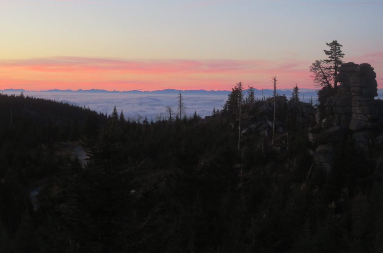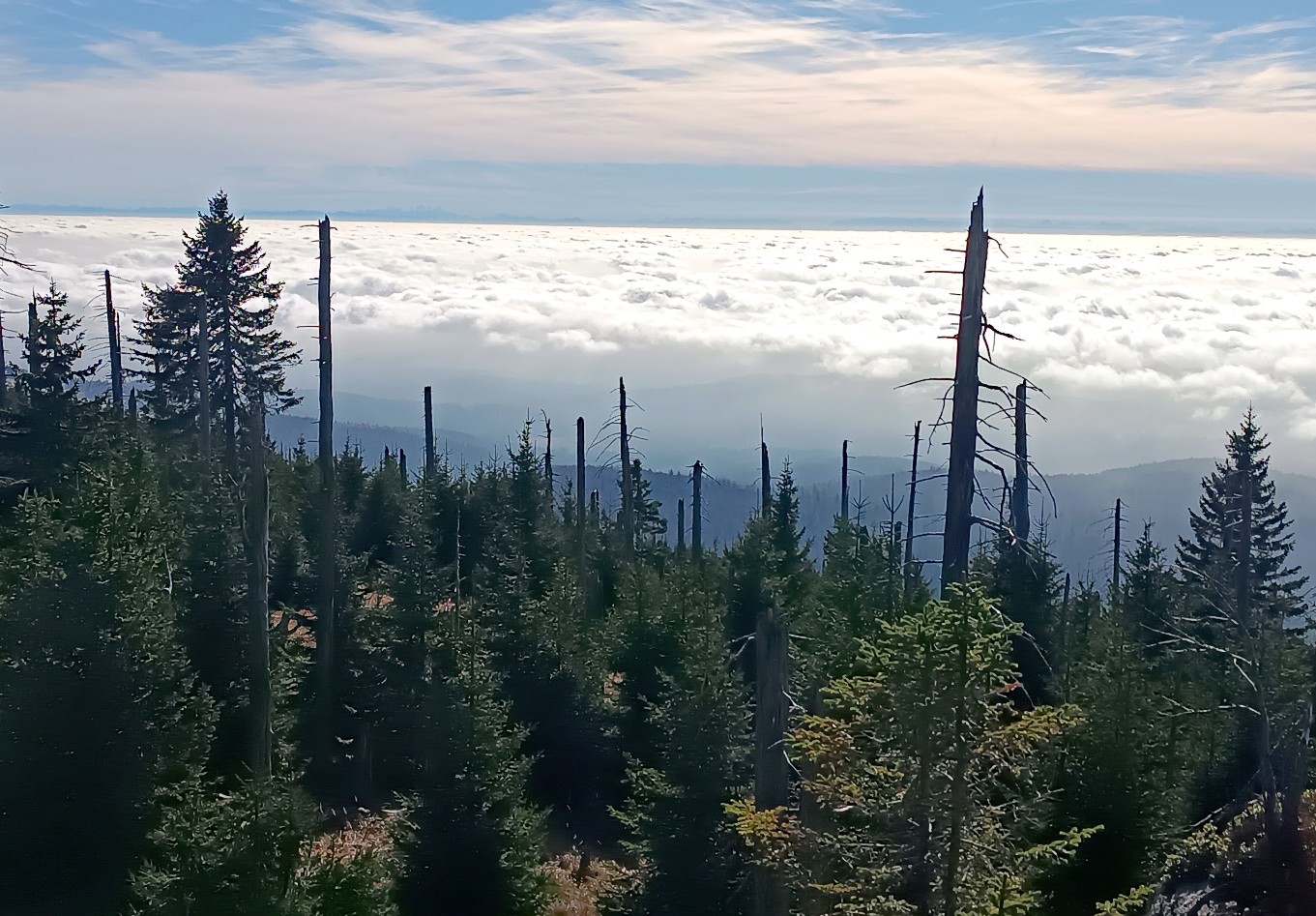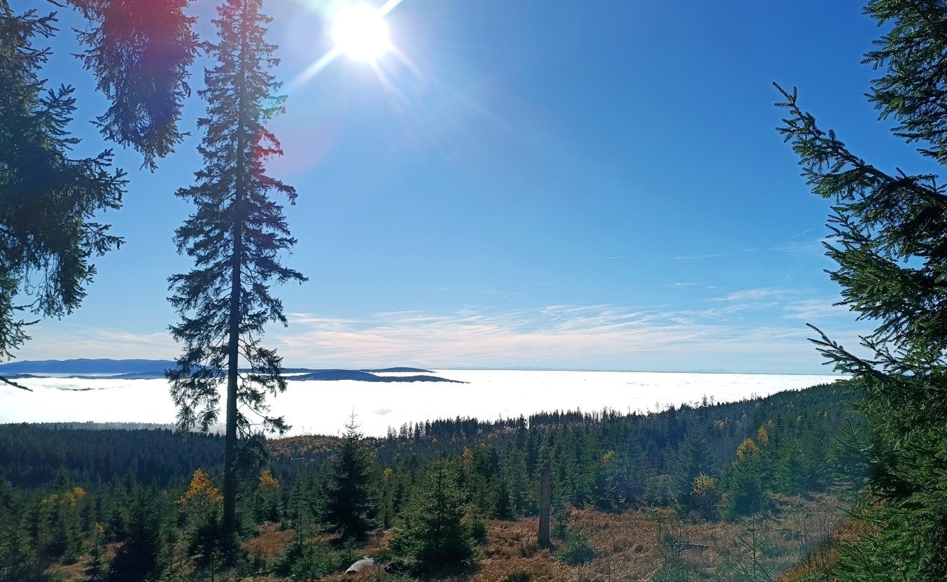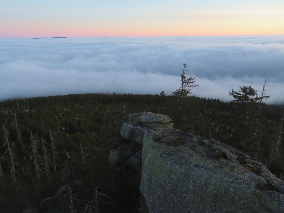 V rámci podzimních expedičních měření, údržby a přípravy meteorologických stanic na zimní sezonu, jsme při této příležitosti měli možnost v posledních dnech díky příznivým podmínkám několikrát zdokumentovat některé šumavské inverze pěkně z nadhledu. Fotografie sice nenahradí skutečnou atmosféru, nicméně pro přiblížení si dovolíme níže prezentovat několik amatérských snímků šumavské inverze z oblasti Třístoličníku, Plechého a Trojmezné, nad Bučinou, z vrcholu Boubína, Blatného vrchu nebo z obou vrcholů Falkensteinu. Letošní velmi teplé slunečné období ve vyšších polohách Šumavy bylo nezvykle dlouhé, přesto jak dokazují i přiložené snímky, je zde každý den jiný.