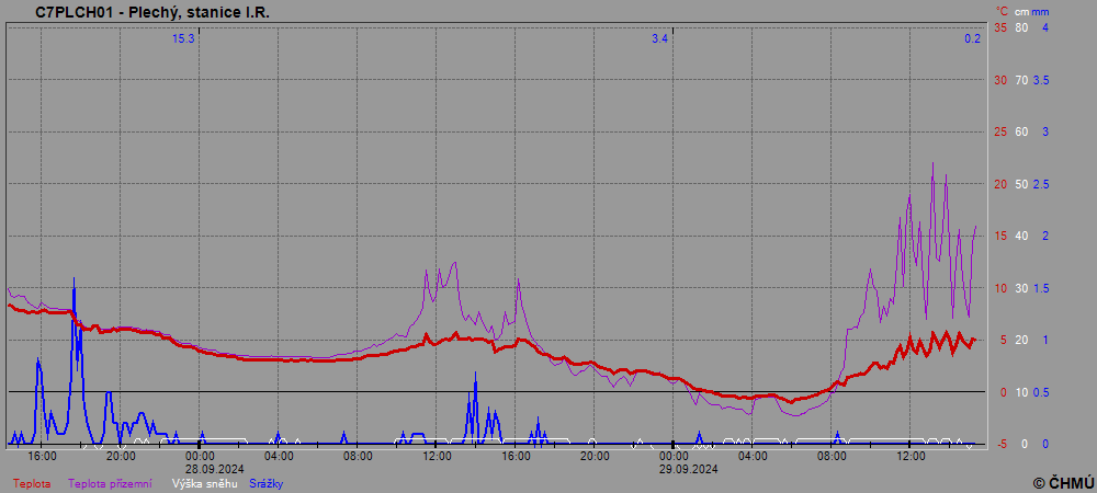Při postupu tlakové výše přes střední Evropu směrem k severovýchodu se nad Šumavou v druhé polovině noci vyjasnilo. To přineslo v chladnějším proudění záporné teploty nejen do mrazových lokalit, ale i na hřebeny našich hor. Po deštivých dnech tak bylo leckde možné pozorovat mrznoucí vodu jak na vegetaci, tak na stezkách, dřevěných či kamenných površích. My jsme překrásné slunečné, ale mrazivé podzimní ráno zaznamenali na hřebenu Šumavy v neděli 29. září, konkrétně v oblasti Trojmezné. Na meteorologické stanici Plechý jsme nad ránem naměřili teplotu vzduchu -1,0 °C, v přízemní vrstvě bylo minimum teploty -2,4 °C. Podobně tomu bylo i na dalších vrcholech, a to nejen šumavských, ale i třeba v Krkonoších či oblasti Jeseníků (viz průběžná ranní tabulka ČHMÚ nejnižších teplot pro 29. září 2029). Vůbec nejnižší teplotu vzduchu u nás dnes ale naměřila stanice Stögrova Huť, Jedlový potok v mrazovce u Volar, kde jsme registrovali minimum -4,4 °C.