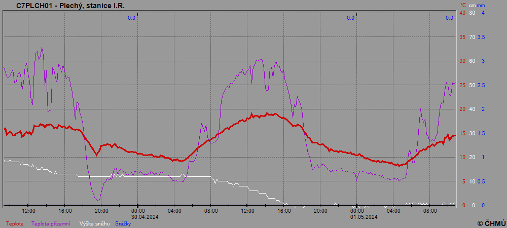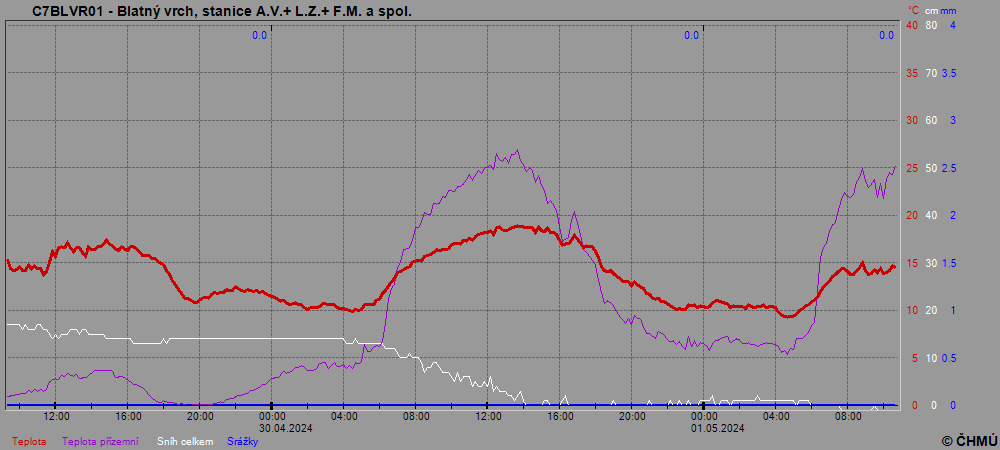Dotávání sněhu na našich vrcholových stanicích Blatný vrch a Plechý 30. dubna dokumentují níže uvedené grafy (zdroj: ČHMÚ), zbytky sněhu zaznamenané 2. května i několik snímků pod textem. V zastíněných místech, kam nemůže slunce a teplý vítr se občas jedná o sněhové ostrovy dosahující místy výšky kolem půl metru. Na bavorské straně Šumavy je viditelný poslední sníh tradičně nejvíce v oblasti Velkého Javoru a Velkého Roklanu. Díky počasí a příznivé viditelnosti bylo možné počátkem května ze šumavského hřebenu s trochou fantazie na dálku zkontrolovat i stav sněhu v Alpách 🙂 jak také dokumentují přiložené snímky. Vzhledem k předpokládanému výhledu počasí dle ČHMÚ budou v dalších dnech zbytky sněhu ze Šumavy většinou i nadále rychle mizet.