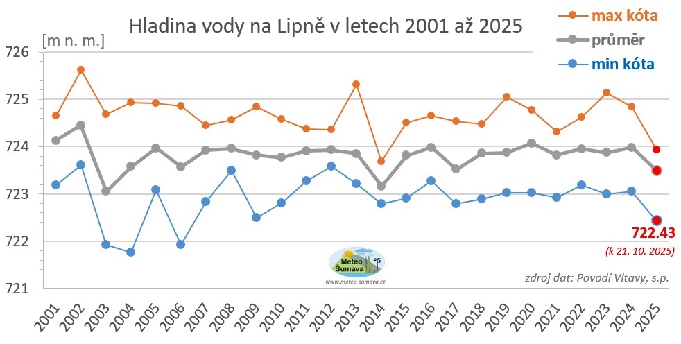 V říjnu se hladina Lipna obvykle drží na kótě mezi 723 a 724 metry nad mořem. Letos je však nižší o zhruba 1 až 1,5 metru, aktuálně je hladina na kótě 722,43 m n. m. (k 21. 10.). Pokud se podíváme do historie posledních 25 let, nižší hodnoty byly zaznamenány pouze v letech 2003, 2004 a 2006, kdy hladina klesla i pod kótu 722 metrů nad mořem. Před dvěma lety zažila přehrada zcela opačnou situaci. Na Vánoce 2023 dosáhla hladina Lipna nejvyšší hodnoty za poslední dekádu (725,15 m n. m.). Mohly za to deštivý listopad a vydatné sněhové srážky na začátku prosince, po kterých následovala výrazná obleva spojená s dalšími dešťovými srážkami. Podrobnosti jsme tehdy přinesli v článku Hladina Lipna na desetiletém maximu.