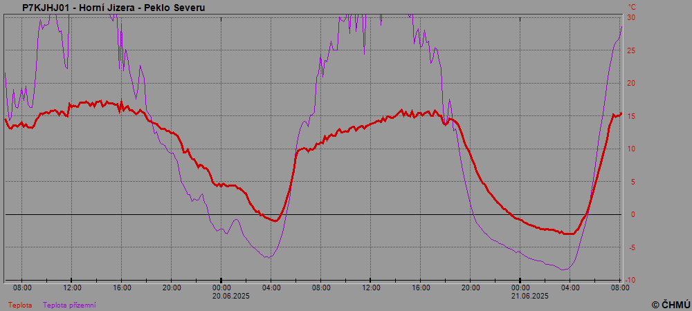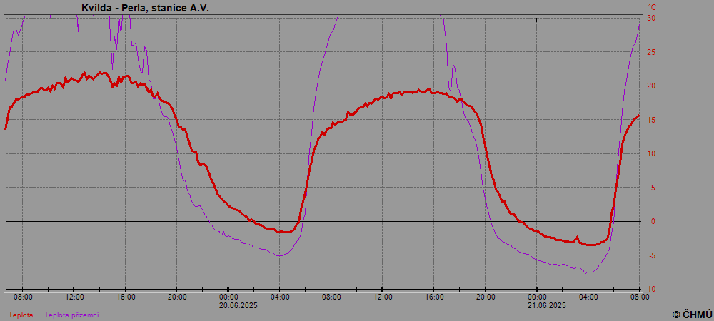 Kde všude 21. června 2025 mrzlo, ukazuje názorně přehled v tabulce. Nejsilnější mráz -3,6 °C jsme naměřili shodně na Šumavě na stanici Kvilda – Perla a v Krušných horách na stanici Jelení, také v Jizerských horách klesla teplota vzduchu více pod bod mrazu, zejména na Horní Jizeře s minimem -3,0 °C. Mrzlo i na stanicích v Orlických a Novohradských horách. Celkem dnešní mrazový letní slunovrat dle dostupných dat aktuálně evidujeme na 20 stanicích. V přízemní vrstvě mrzlo nejsilněji na Horní Jizeře v Jizerských horách, kde čidlo přízemního teploměru ukázalo minimální hodnotu -8,5 °C.