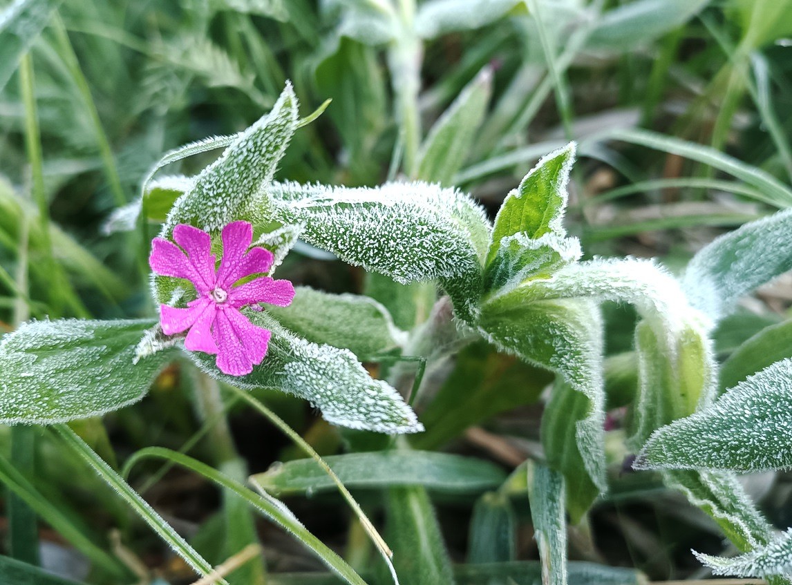 Mrazový letní slunovrat 2025 na Šumavě, ranní jíní na kvetoucí vegetaci
