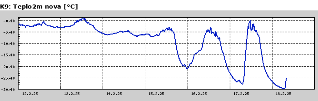Mráz pod -30 °C dne 18. února 2025 v záznamu stanice Horní Jizera
