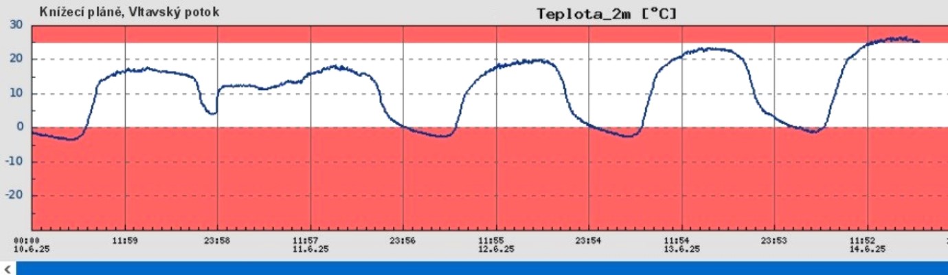 Obr. 2 a 3. Několik červnových mrazů a první mrazoletní den 14. června 2025 na grafech stanic Knížecí Pláně, Vltavský potok a Kvilda – Perla