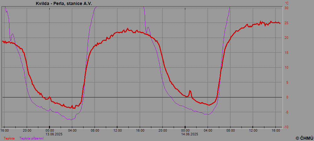 Začátkem června to chvíli vypadalo, že si od mrazíků i na horách odpočineme, ale už na konci první letní dekády na mnoha stanicích Šumavy, i některých mimošumavských, znatelně přimrzlo (více v článku: První letní mráz, na Šumavě místy až -4 °C). Ani další dny následující dekády nás nenechávají v klidu a na mrazových lokalitách se vyskytuje letní mráz. Ve čtvrtek 12. června jsme na stanicích Jelení v Krušných horách a na nedaleké Rolavě naměřili mráz -3,4 resp. -3,2 °C, na Šumavě byla zaznamenána minima teploty na stanicích Rokytská slať -3,0 °C a Knížecí pláně, Vltavský potok -2,7 °C, v Jizerských horách na stanicích Jizerka rašeliniště -2,1 °C a Horní Jizera -2,0 °C, v Orlickém Záhoří klesly hodnoty teploty vzduchu na -1,8 °C. Aby pátek 13. června nezůstal pozadu, vytvořily se nejvhodnější podmínky pro zaznamenání mrazu zejména na Šumavě, kde Kvilda – Perla registruje teplotní minimum -3,8 °C, Rokytská slať -2,8 °C a Knížecí pláně, Vltavský potok stejně jako ve čtvrtek -2,7 °C. Mráz se tento den vyskytl na vícero lokalitách, Sobota byla sice na mráz o něco skoupější, ale o to zajímavější. Ráno byl naměřen mráz tradičně na některých mrazových lokalitách Šumavy (např. na stanicích Kvilda – Perla -2,7 °C, Knížecí pláně, Vltavský potok -1,4 °C či u Volar na Stögrově Huti -0,3 °C) nebo Jizerských hor (např. Horní Jizera -2,4 °C, Velká Jizerská louka -2,4 °C, či Jizerka rašeliniště -2,2 °C), ale kromě ranního mrazu se totiž teploty na několika šumavských lokalitách dostaly ten samý den i nad letních 25 °C. Díky tomu byl 14. června na Šumavě zaznamenán letošní první mrazoletní den.