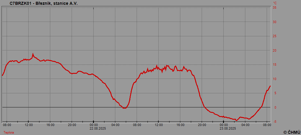 Jak avizoval ve své předpovědi ČHMÚ: mezi tlakovou níží nad Skandinávií a tlakovou výší nad Britskými ostrovy bude zejména v sobotu na naše území proudit studený vzduch od severozápadu až severu. Ve spojení s nočním vyjasněním tak díky tomu klesla teplota vzduchu na mnoha místech Šumavy pod bod mrazu, a to hlouběji než v minulých týdnech. V pátek ráno jsme sice zaznamenali také letní mráz, ale jen velmi slabý a pouze na Březníku (-0,3 °C). První srpnový mráz letos nebyl o moc silnější (psali jsme o tom v článku: První srpnový mráz, pět šumavských stanic s teplotou pod nulou), ale hned den na to zaznamenala stanice Kvilda – Perla mráz -4,1 °C. Na stejné stanici bylo naměřeno i minimum prvního letního měsíce června s hodnotou -4,4 °C (uvedli jsme v pravidelném měsíčním přehledu: V červnu mrzlo nejvíce na Perle). V červenci nebyly díky převládajícímu počasí s velkou oblačností pro mrazové dny vhodné podmínky (více v článku: V červenci mrzlo jen na sedmi stanicích), tak se očekávalo, zda v srpnu bude situace odlišná a zda se podaří překonat dosavadní letní minimum. Stalo se tak právě v sobotu 23. srpna, kdy jsme na Březníku naměřili zatím letošní nejsilnější letní mráz s hodnotou -4,6 °C.