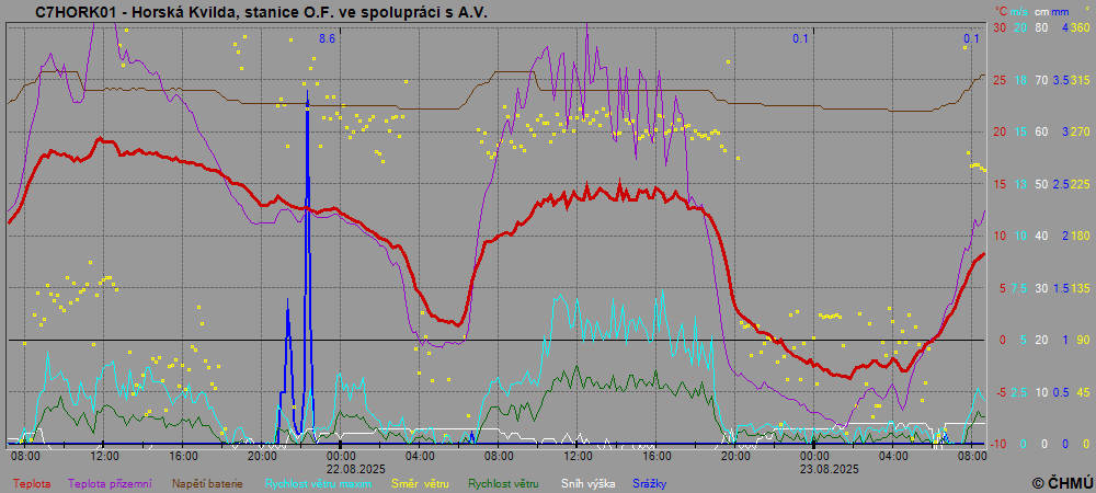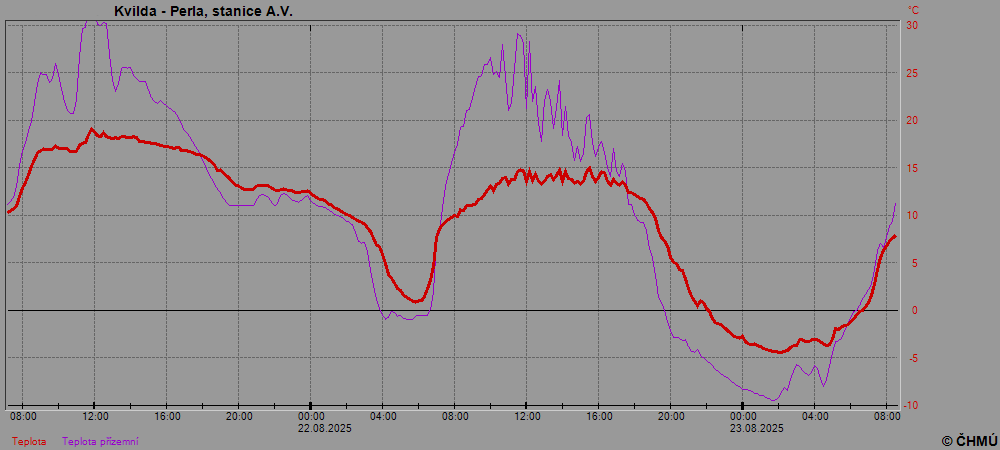 Průběh teploty vzduchu s nízkými hodnotami v noci na 23. srpna 2025 na stanicích Březník, Horská Kvilda a Kvilda – Perla