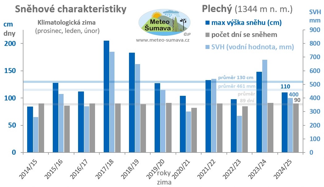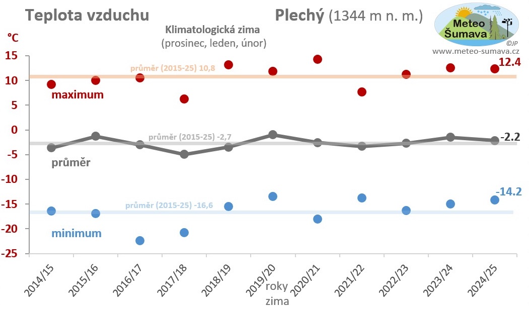 Meteorologická stanice Plechý měří automaticky teplotu vzduchu a výšku sněhové pokrývky v nadmořské výšce 1344 m n. m. již jedenáctou zimu. K tomu se provádí některá souběžná manuální měření. Lze tak orientačně porovnat, jaká byla meteorologická zima 2024/2025 (prosinec, leden, únor) z hlediska některých teplotních a sněhových charakteristik. Na standardní klimatologické hodnocení a porovnání je ovšem stávající pozorovací řada nadále nedostatečná.